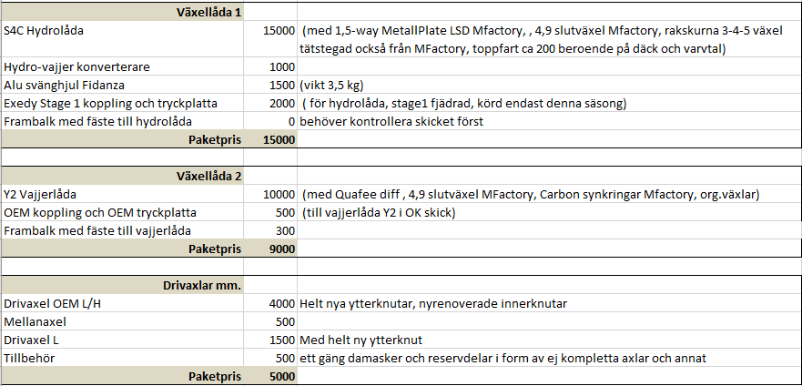 Växellåda1/Växellåda2/drivaxlar: 15.000:-/9.000:-/5.000