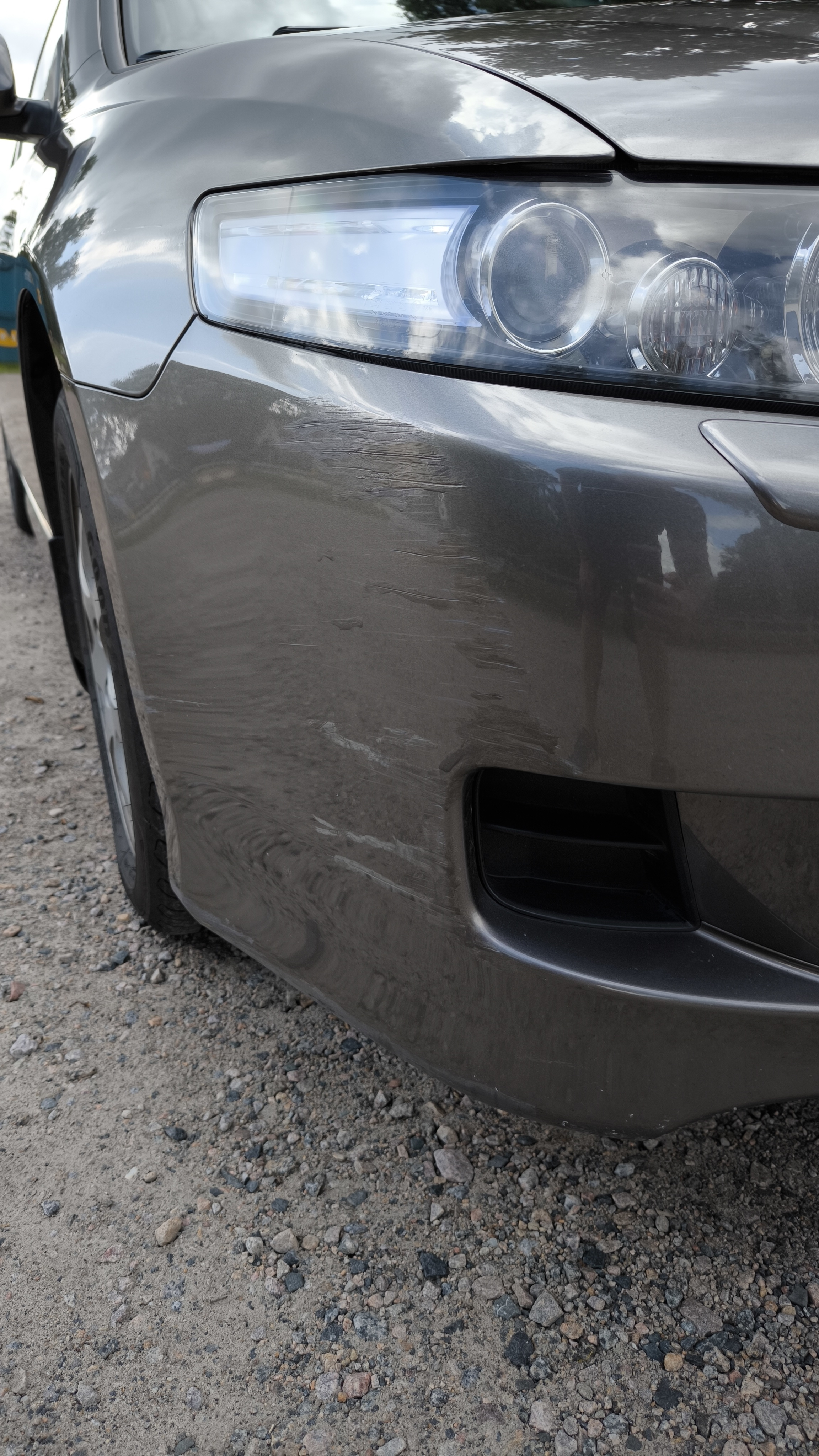 Parkeringsskada på kofångaren fram, höger sida.